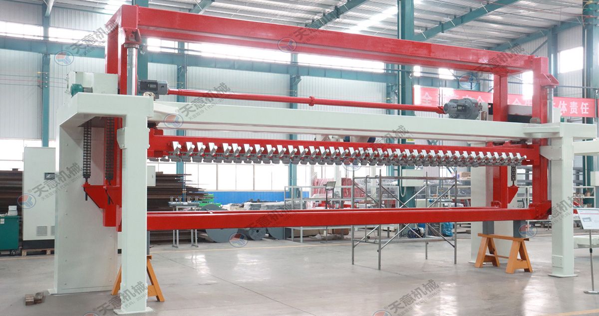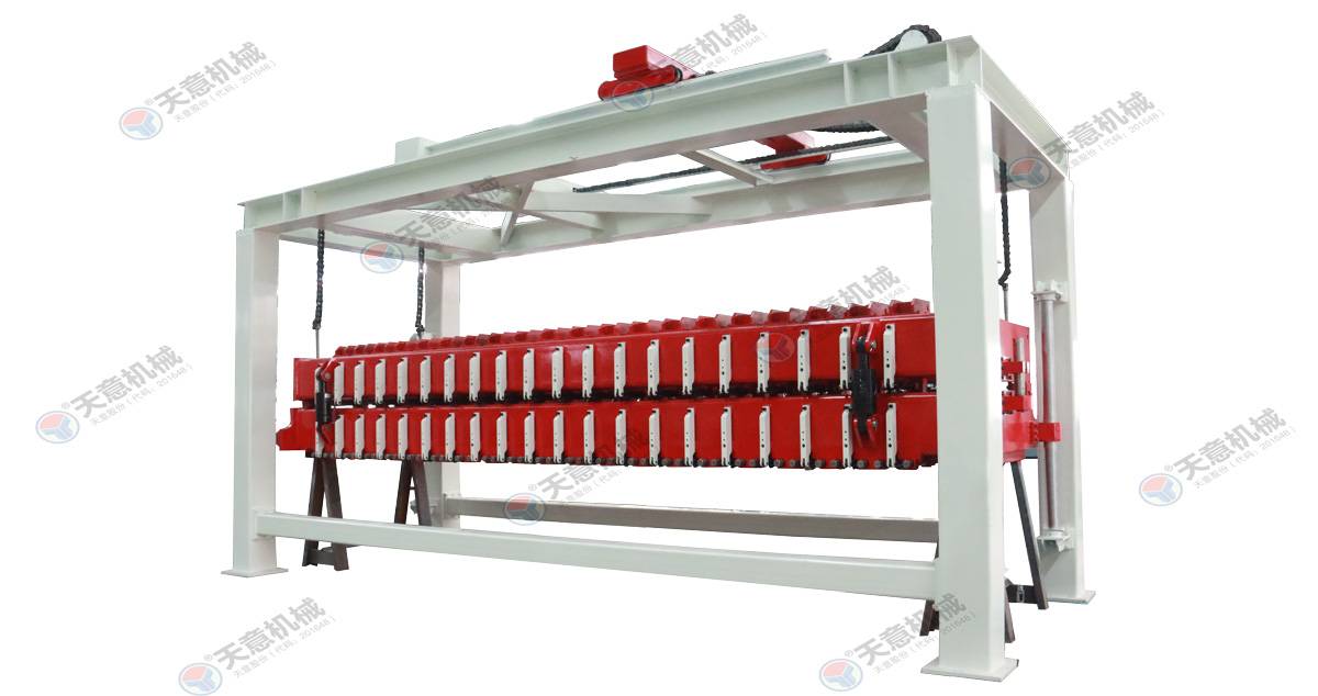 成品分垛吊機:將蒸養車上的一模坯體吊運至掰板輸送機上,然后將空側板吊運至蒸養車上;切割工段空翻脫模機將模框翻轉90°,放在切割小車支座上進行脫模,脫模后的模框與清理后的側模板進行合模,合膜后的空模框被吊...